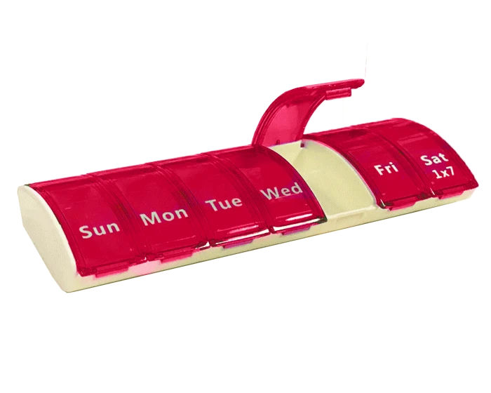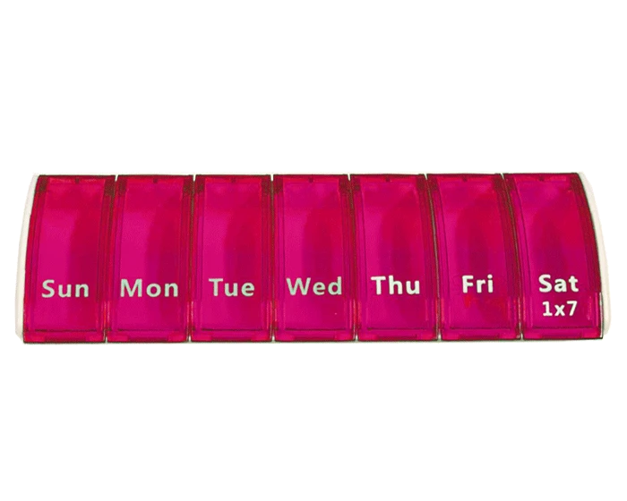 Pillendoos in het roze met zeven opbergvakken voor een hele week. Op de pillendoos staat in het Engels de eerste letter van de dag aangegeven.
