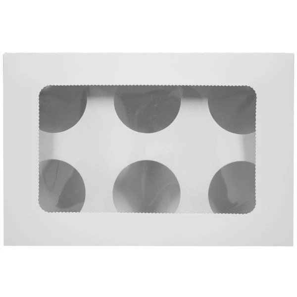 Voordeelverpakking witte kartonnen cupcake doos met venster. Het doosje heeft een insert voor 6 cupcakes (Ø6cm). Het doosje heeft een afmeting van 25 x 16,5 x 7,5cm (LxBxH). Inhoud: 24 stuk Kleur: Wit
