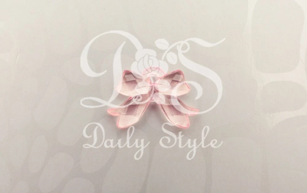Mini acryllen strikje in roze transparant. De strikjes hebben een afmeting van 2,8 x 2 cm met een dikte van 0,5 cm. Eén verpakking bevat 12 strikjes.