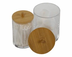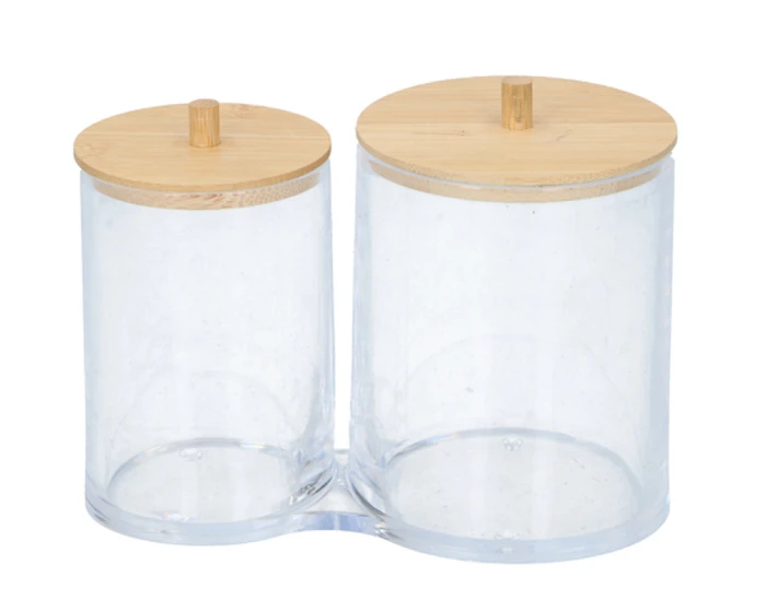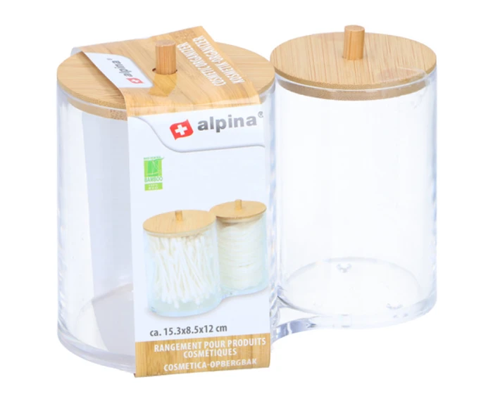 Praktische en mooie cosmetica organizer met twee opbergbakjes (incl. bamboe deksel) van het merk Alpina. De kleinere vak is perfect geschikt voor wattenstaafjes en de grotere vak is ideaal voor bijvoorbeeld wattenschijfjes. De organizer heeft een afmeting van 15,5x8x13,3cm.