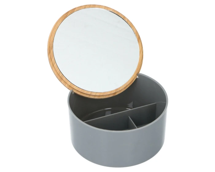 Met deze cosmeticadoos met spiegel van Alpina kan je al je kleine cosmetica spullen netjes opbergen, en ze ook gemakkelijk meenemen als je ze ergens anders nodig hebt. De organizer heeft aan de binnenkant 3 vakken en heeft een afmeting van 13 (doorsnede) x 7 (h) cm. Het spiegseldeksel is gemaakt van bamboe.