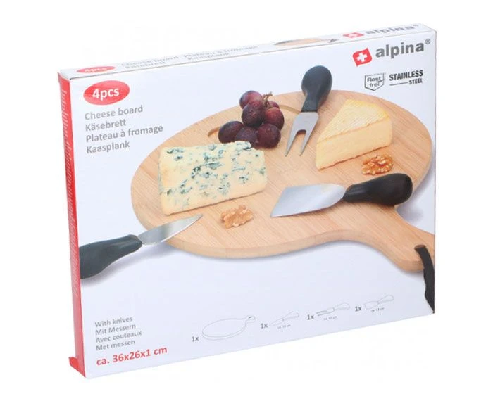 Alpina kaasplank set met twee messen en een vork. De kaasplank is gemaakt van bamboe en heeft een afmeting van 36x26x1cm. De messen en vork zijn 13cm lang.