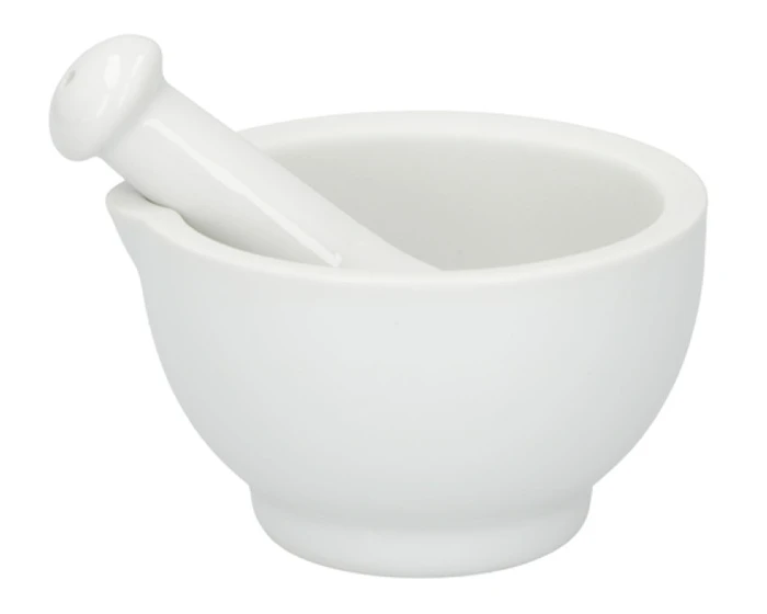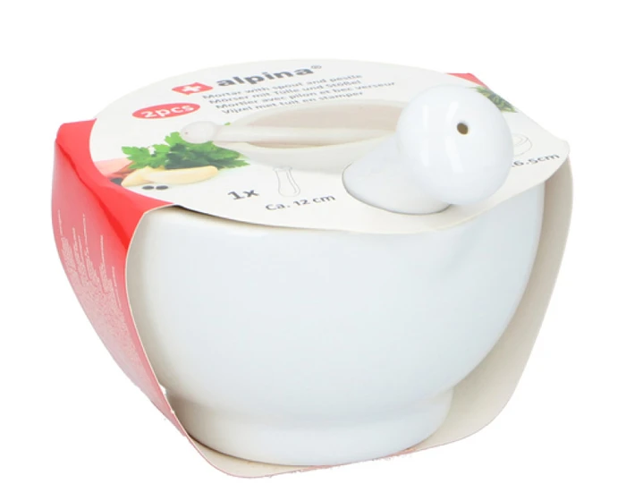 Porceleinen vijzel met tuit en stamper van Alpina. De vijzel heeft een doorsnede van 10cm en is 6,5cm hoog. De stamper heeft een lengte van 12cm.