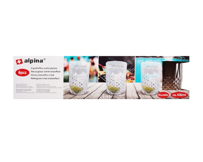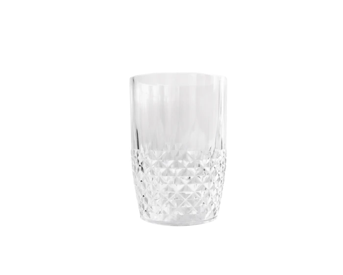 Plastic waterglazen met kristaleffect. Herbruikbaar, decoratief en duurzaam. Geen zorgen meer over gebroken glas. Ideaal voor feeste, trouwerijen, picknicks en barbecues. Eén set bestaat uit 6 glazen van 400ml.