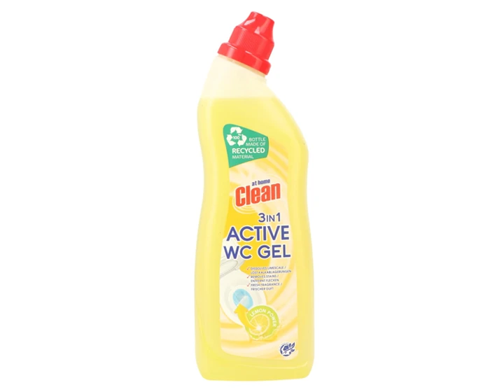 AT HOME Active Gel met frisse citroengeur verwijdert kalkaanslag en vlekken. Een fles bevat 750ml aan reinigingsgel.