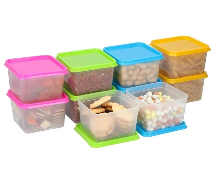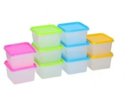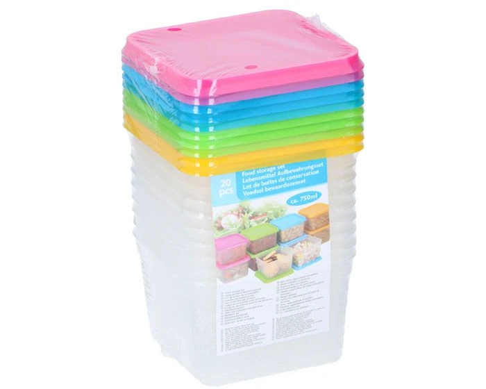 Set van tien opbergdozen/vershoudbakjes die je netjes op elkaar kunt stapelen om minder ruimte in beslag te nemen. Een bakje heeft een inhoud 750ml.