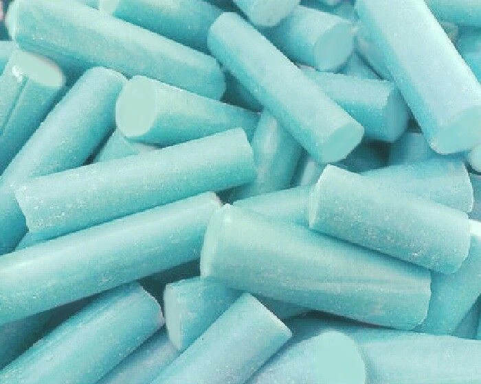 Gekleurd suikerwerk met vruchtensmaak (blauw). Eén zak bevat ca. 1kg zuurstokjes.