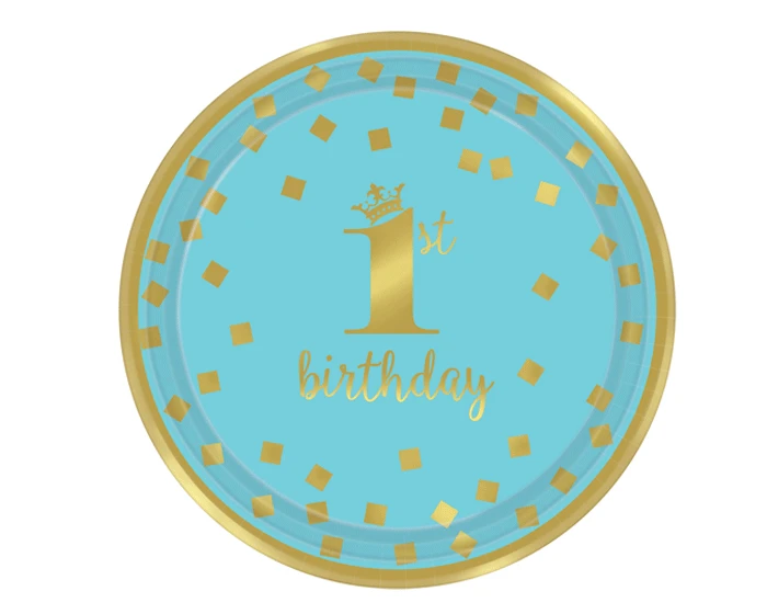 Chique papieren bordjes bedrukt met gouden tekst ‘1st birthday’. Leuk voor een 1e verjaardagsfeestje. Eén bordje heeft een doorsnede van 17,8 cm en is verpakt per 8 stuks.