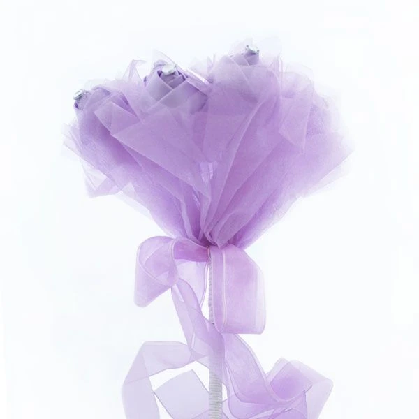 Een boeket van satijnen bloembollen met een strass steentje en tule. Het boeket bestaat uit 9 bloembollen en is ca 23cm groot met een dia van 15-17cm. Het gevlochten handvat is 12cm lang.