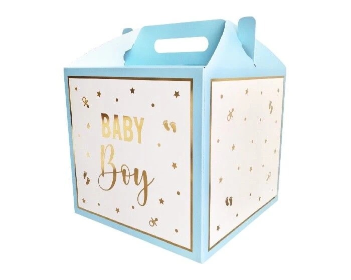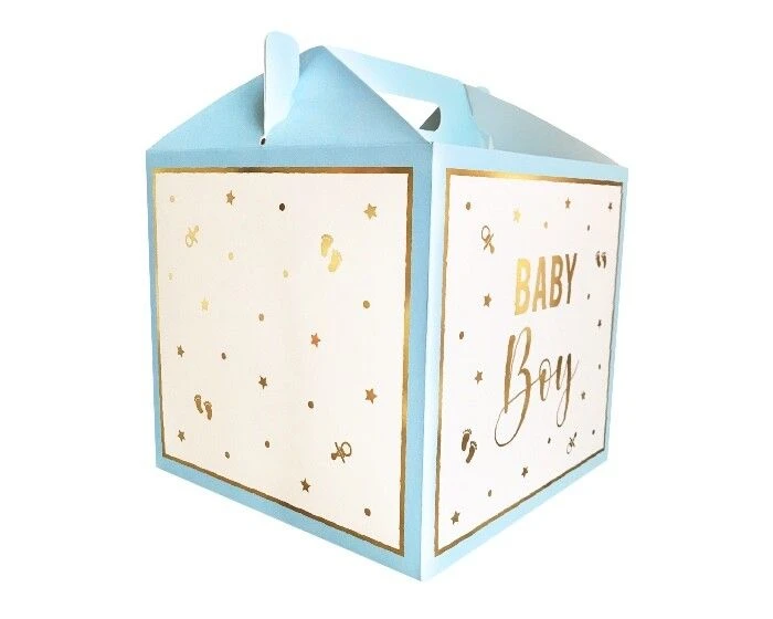 Blauwe XL cadeaudoos met de tekst “Baby Boy” en kleine figuren bedrukt in goudfolie. Leuk om te vullen met cadeautjes voor de aanstaande mama en haar baby. De kartonnen XL vouwdoos is 28x28x26cm (LxBxH) groot en bevat een handvat van 7cm hoog. De bak wordt platgeleverd.
