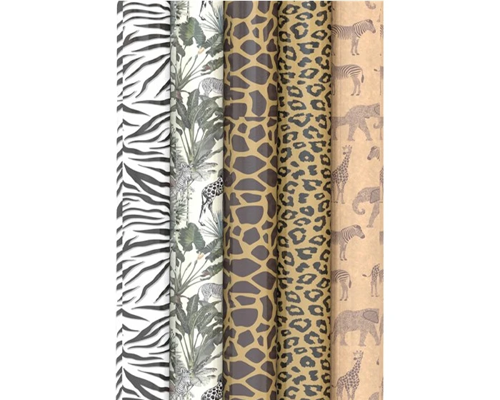 Mooi inpakpapier in vijf verschillende safari/jungle designs om cadeaus mee in te pakken. Je ontvangt van elke design 1 rol. De afmeting van een rol is 200x70cm.