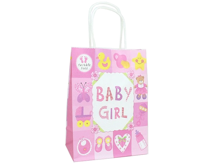 Schattige papieren cadeautasje met de tekst ‘BABY GIRL’ en verschillende baby gerelateerde afbeeldingen. De tasjes zijn 21 x 15 x 8 cm groot en verpakt per 6 stuks.