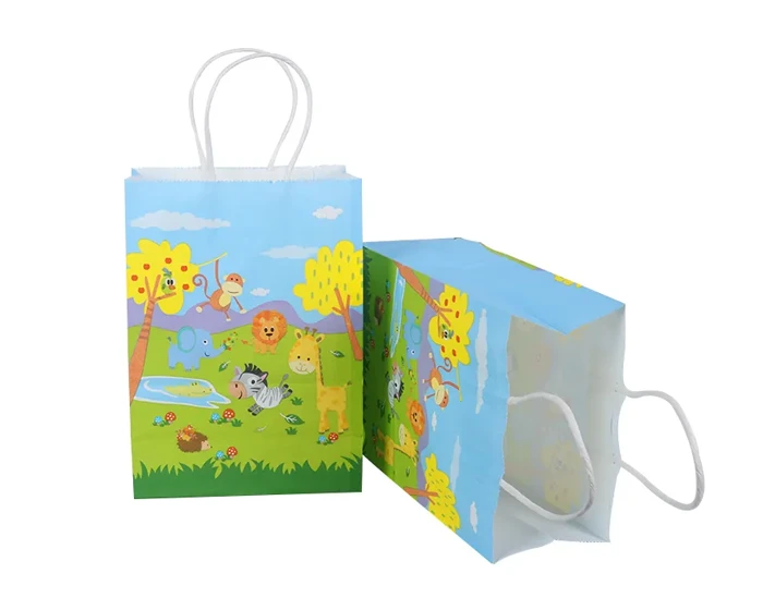 Schattige papieren cadeautassen met verschillende dieren erop. Ideaal voor een kinderfeestje! De tassen zijn 27x21x11cm (excl. handvat) groot en verpakt per 6 stuks.