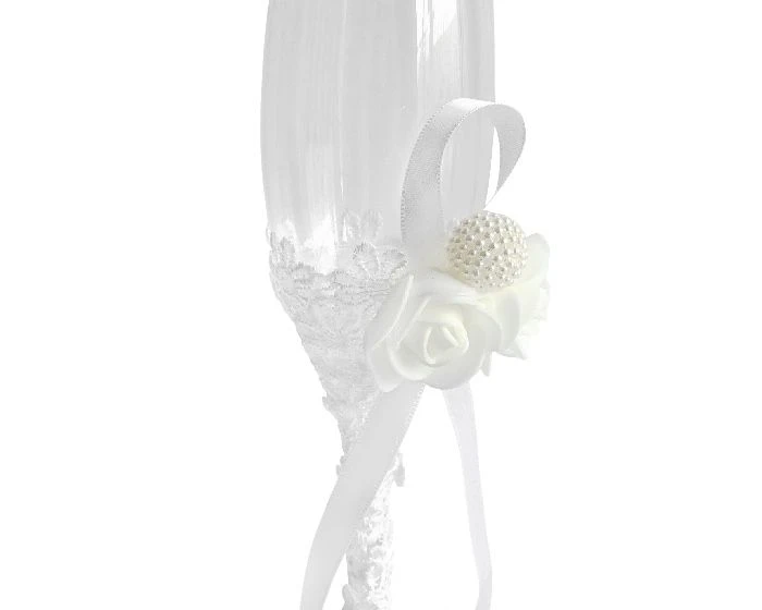 Twee champagneglazen met kanten decoratie en kunst roosjes. Het glas heeft een hoogte van 23cm en een diameter van 5cm.