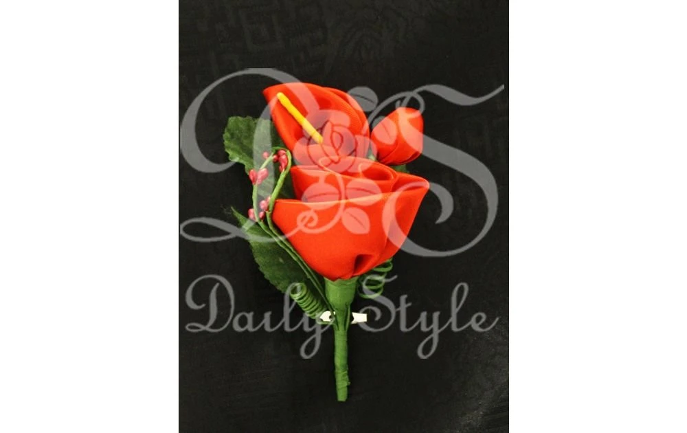 Corsage van satijnstof in het rood. De corsage bestaat uit een groter bloem met allerlei kleinere stengels. Aan de achterkant is er een speldje. De corsage is circa 12cm lang en tot 9 cm breed.