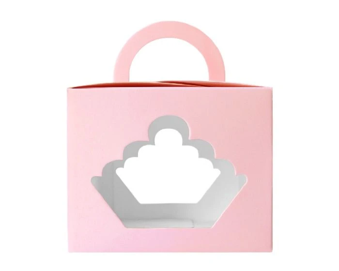 Kartonnen cupcake doos met aan twee zijden een open venster. Aan de bovenkant zit een handvat zodat je de doos makkelijk kunt vervoeren. De doos wordt geleverd met een inlegger waar je de cupcake in kan plaatsen.