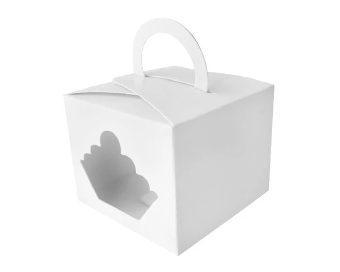Kartonnen cupcake doos met aan twee zijden een open venster. Aan de bovenkant zit een handvat zodat je de doos makkelijk kunt vervoeren. De doos wordt geleverd met een inlegger waar je de cupcake in kan plaatsen.