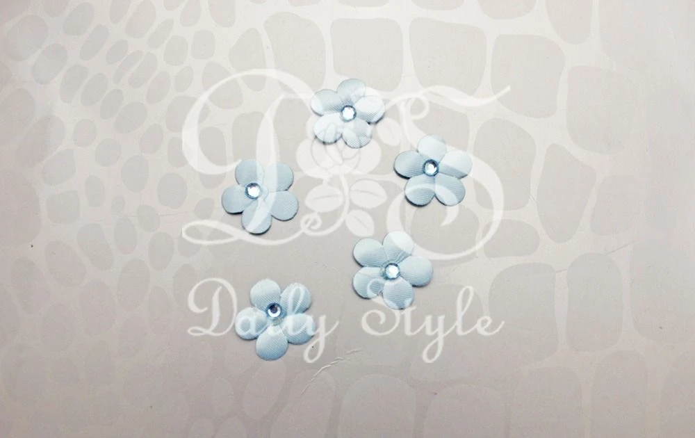Satijnen decoratie bloemetjes met steentjes in het blauw. De bloemetjes hebben een doorsnede van 2cm en zijn per 24 stuks verpakt.