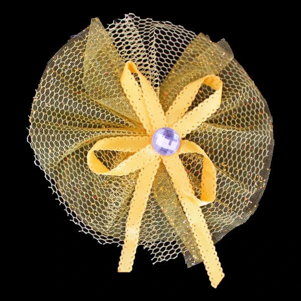Decoratie strik van tule in het goud. Het embleem heeft een diameter van ca 8 cm en is verpakt per 12 stuks.