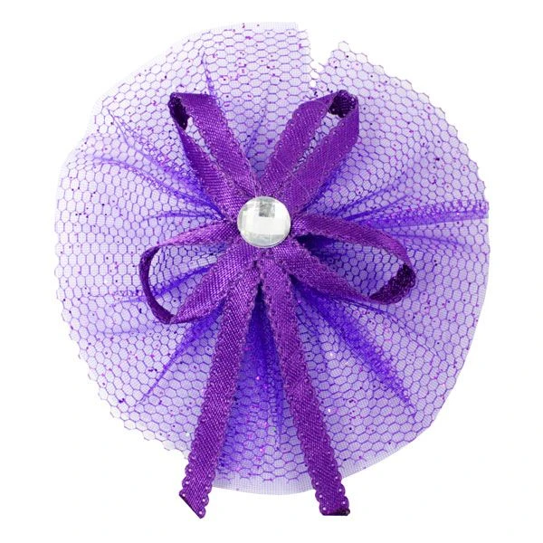 Decoratie strik van tule in het paars. Het embleem heeft een diameter van ca 8 cm en is verpakt per 12 stuks.