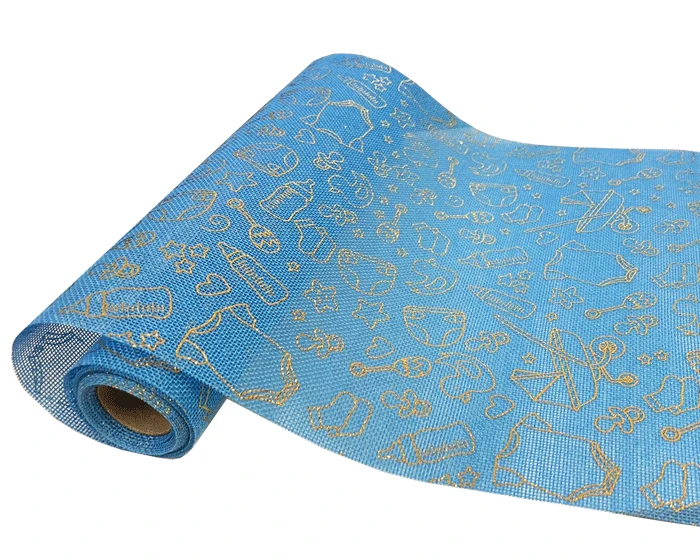 Prachtige decoratiestof/tafelloper van non-woven met baby gerelateerde figuren in glitter gouden bedrukking. De loper is 28 cm breed en zit op een rol van 2,7 meter lang.