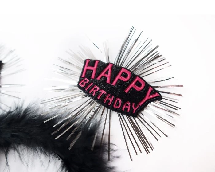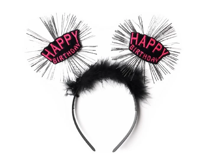 Zwarte diadeem met de tekst ‘Happy Birthday’ in het fuchsia en versiering in het zilver van plastic. De diadeem is ca. 22cm hoog en 20cm breed.
