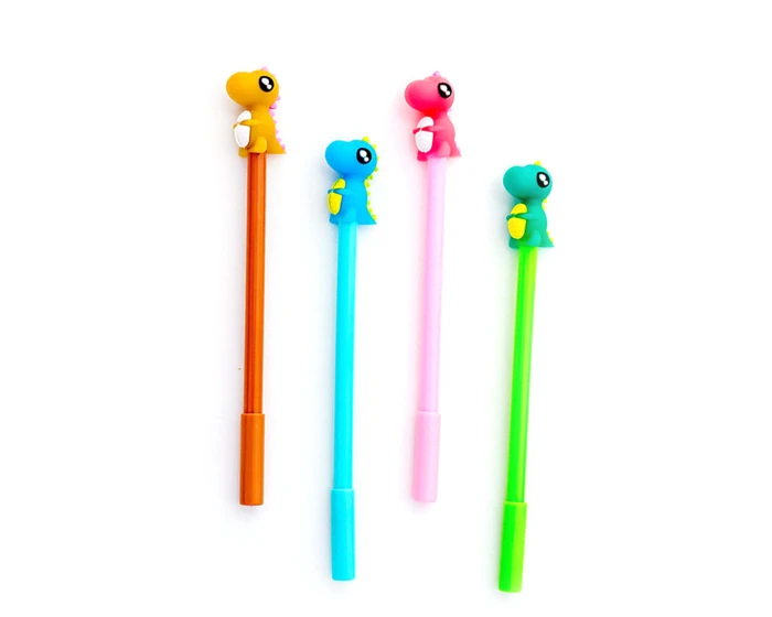 Softplastic fruit pennen met een fijne blauwe punt en bovenop een dinosaurus. De pen is 18,5 cm lang. Een pak bevat 3 pennen. De kleuren van de pennen kunnen per pak verschillend zijn.