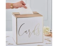 Prachtige witte enveloppendoos met de tekst ‘Cards’ in het goud van Ginger Ray. In deze enveloppendoos kunnen de gasten hun envelop stoppen. De kartonnen doos wordt plat geleverd en is gemakkelijk in elkaar te zetten.