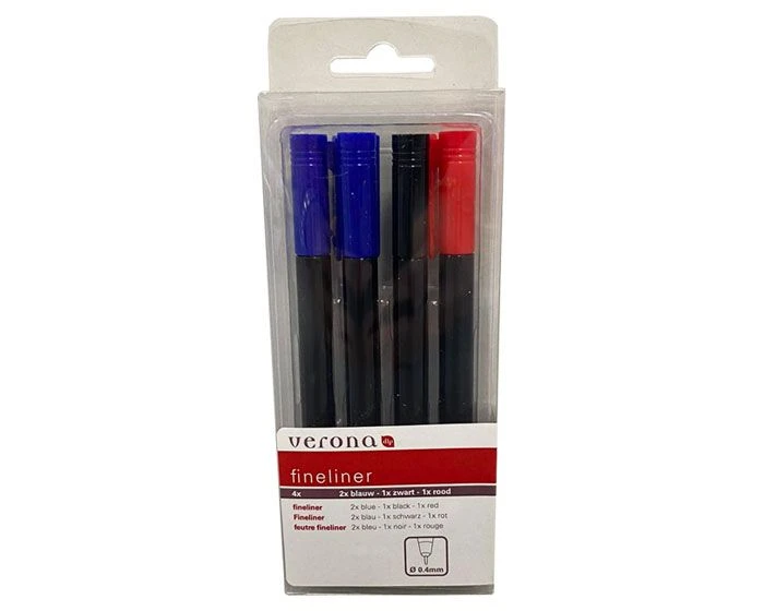 Set van vier fineliners in de kleuren rood, zwart en blauw.