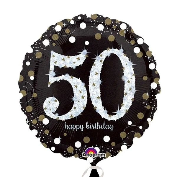 Zwarte folie ballon met metallic gouden en zilveren cirkels & sterretjes voor een 50e verjaardagsfeest. De ballon is 45 cm groot en kan met helium of lucht worden opgeblazen.
