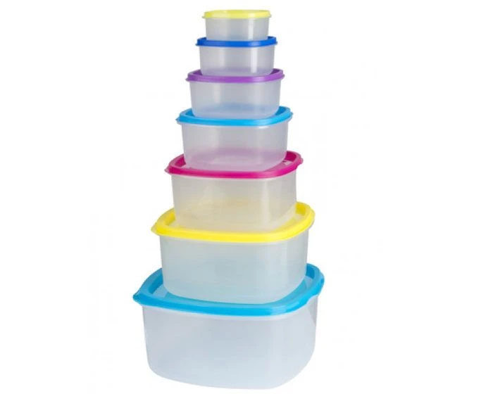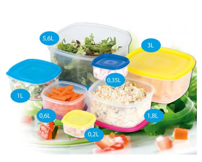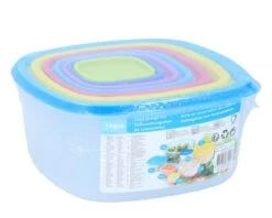 Set van zeven bewaardozen in verschillende maten voor het opbergen van eten zoals groente, fruit en restjes. De bewaardozen hebben een inhoud van: 0,2L, 0,35L, 0,6L, 1L, 1,8L, 3L en 5,6L.