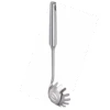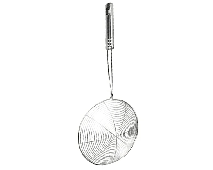 Grote frituurspaan van RVS om vet uit de frituur snel af te laten vloeien. De spaan heeft een doorsnede van ongeveer 17 cm.