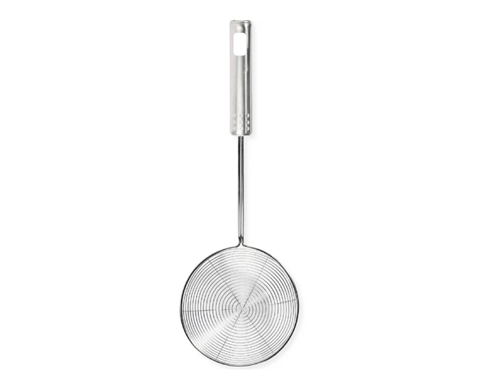 Kleine frituurspaan van RVS om vet uit de frituur snel af te laten vloeien. De spaan heeft een doorsnede van ongeveer 13 cm.