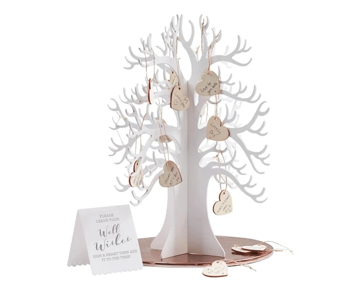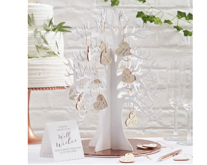 Deze mooie houten wensboom is het perfecte alternatieve gastenboek op je bruiloft. De wensboom bevat 70 houten hartjes om je gasten een kleine boodschap of leuke quote op te laten schrijven. Tip: gebruik een watervaste fineliner voor het beschrijven van de hartjes.