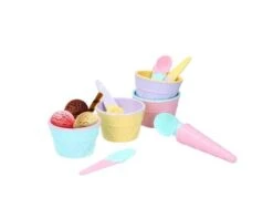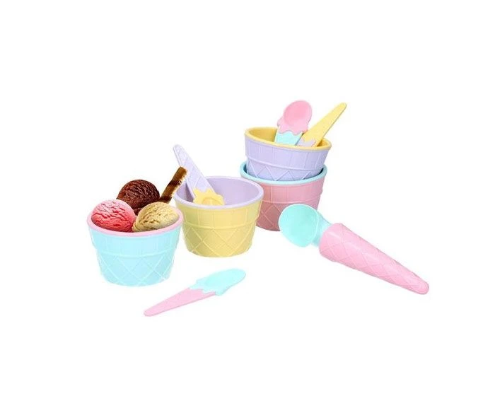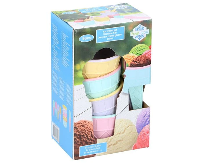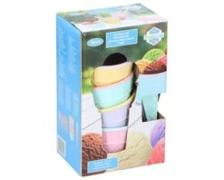 Een ijsje smaakt nog lekkerder in deze geweldige serveerset. De set bestaat uit 4 schaaltjes met een inhoud van 170ml, 4 lepels van elk 12,5cm en 1 ijsschep van 20cm. De snoeperige pastelkleurtjes zijn helemaal ‘on trend’. En wat is het leuk om te eten met een lepel in de vorm van een ijshoorn uit een ‘echt’ ijsbakje. Van deze zomerse must-have zul je heel veel plezier hebben. Ook geschikt voor andere zomerse toetjes en desserten. De set kan gewoon in de vaatwasser.