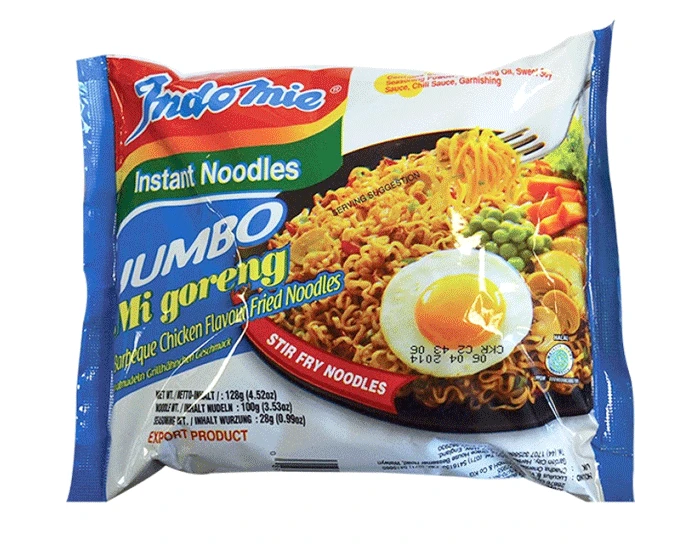 Jumbo verpakking instant noedels met barbecue kippensmaak. Per 5 stuks.