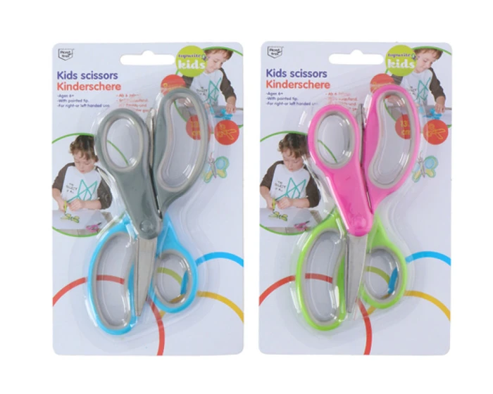 Set van 2 knutselschaartjes voor kinderen (vanaf 6 jaar). Met ergonomische greep en taps toelopende punt. Voor gebruik in rechter- en linkerhand. De scharen bestaan in verschillende kleuren en worden door elkaar geleverd.