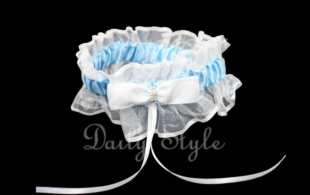 Blauwe kousenband met wit kanten rand en een decoratie strik met strass steentjes. De elastische kousenband heeft, in ongerepte staat, een dia van 11cm en is 6,5cm breed.