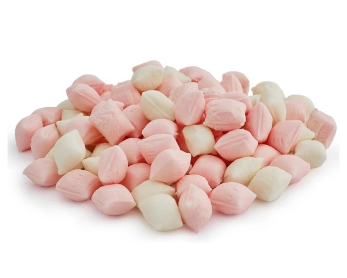 Roze & witte snoep kussentjes. De snoep is hard van structuur en zit in een zak van 1 kg. Leuk als geboorte snoep of baby feestjes.