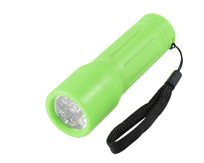 Kleine led zaklamp met 9 led lampjes. De zaklamp werkt op 3 keer AAA batterijen. Batterijen zijn niet inbegrepen.