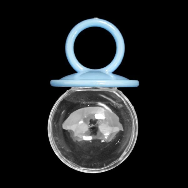 Transparante micaspeen met een blauw schild en ring. Een micaspeen bestaat uit 2 halve bollen die samen worden gehouden mbv een gekleurd schild. De speen heeft een dia van 4,5cm en is ca. 7cm groot. De micaspeen is per 12 stuks verpakt.