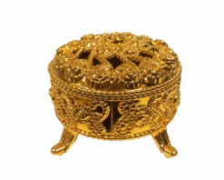 Sierlijke mini doosjes versierd met roosjes in het brons. Leuk om te vullen met bijvoorbeeld snoepjes als gift voor de gasten op een bruiloft. Eén verpakking bevat 12 doosjes. Eén doosje heeft een doorsnede van 5 cm en is ongeveer 3,5 cm hoog (incl. pootjes en deksel). Het opvul oppervlakte exclusief poot is 1,6 cm hoog.