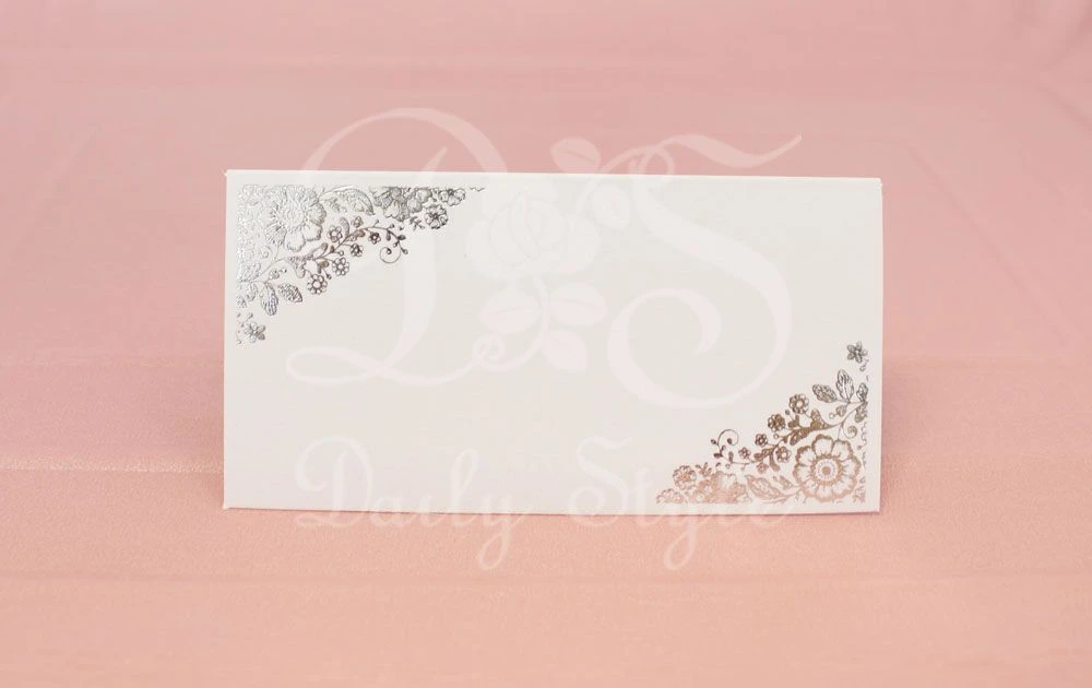 Naamkaartjes met zilveren bedrukking. De kaartjes zijn in gevouwen staat 9,6x5cm (BxH) groot en worden ongevouwen geleverd. De kaartjes zijn per 12 stuks verpakt.