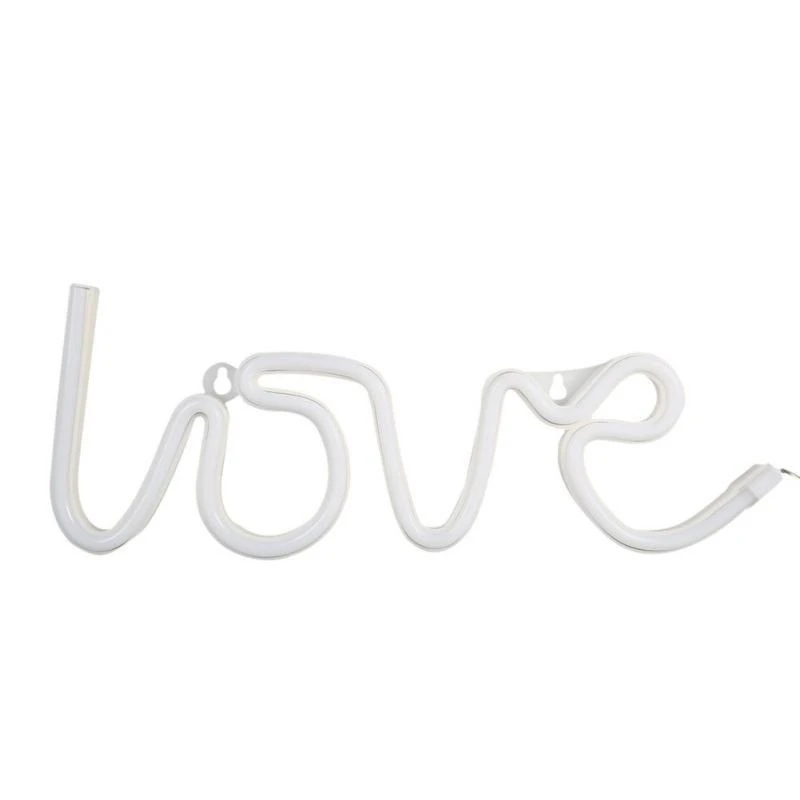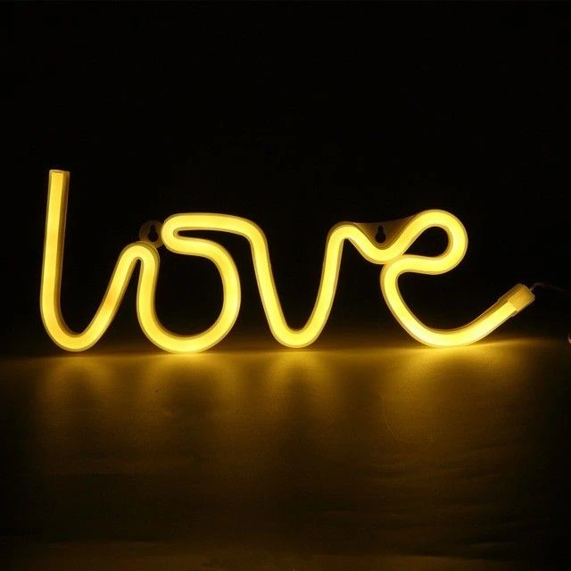 Neon lamp in de vorm van letters ‘love’. De neon led lamp is een echte eyecatcher in elke kamer en je kan deze veilig ophangen of op een kastje neerzetten. Deze lamp geeft warm geel licht af. De lamp werkt op 3 AA batterijen of een USB kabel.
