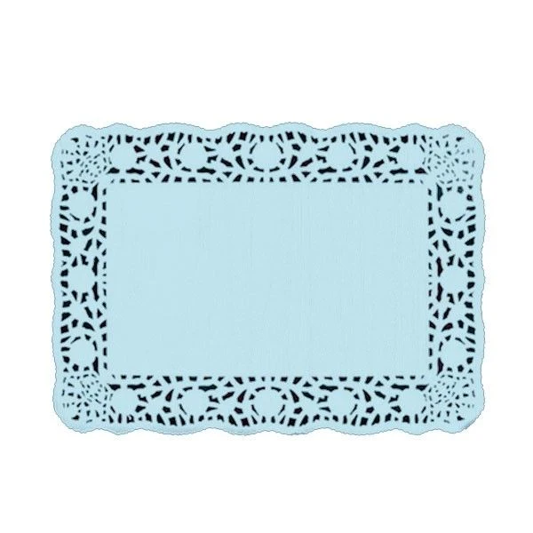 Blauwe onderleggers van papieren kant. De onderleggers hebben een afmeting van 25 x 35 cm en zijn verpakt per 10 stuks.