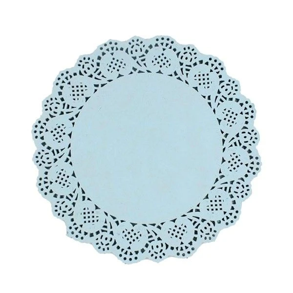 Blauwe onderleggers van papieren kant. De onderleggers hebben een doorsnede van 26 cm en zijn verpakt per 10 stuks.