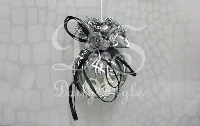 Ronde organzazak in Barok stijl in het zwart. Deze ronde organzazak met lint heeft een diameter van 24 cm. Door aan het lint te trekken wordt het platte stuk stof een mooi bol zakje. Per 12 verpakt