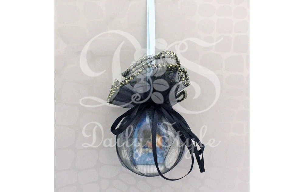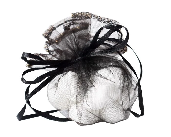 Ronde organzazak in de kleur zwart. Deze ronde organzazak met lint heeft een diameter van 24 cm. Door aan het lint te trekken wordt het platte stuk stof een mooi bol zakje. Per 12 verpakt
