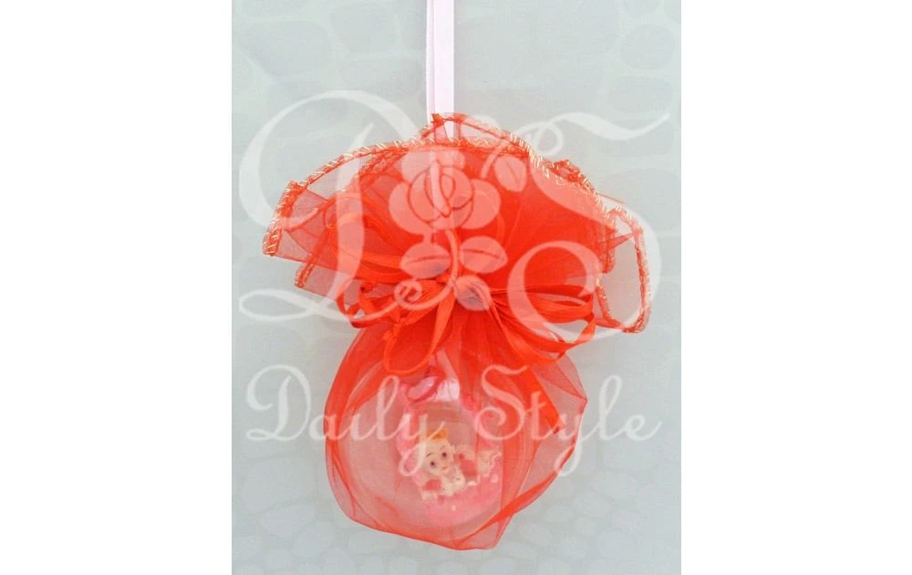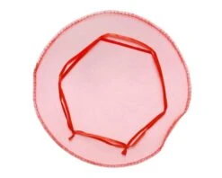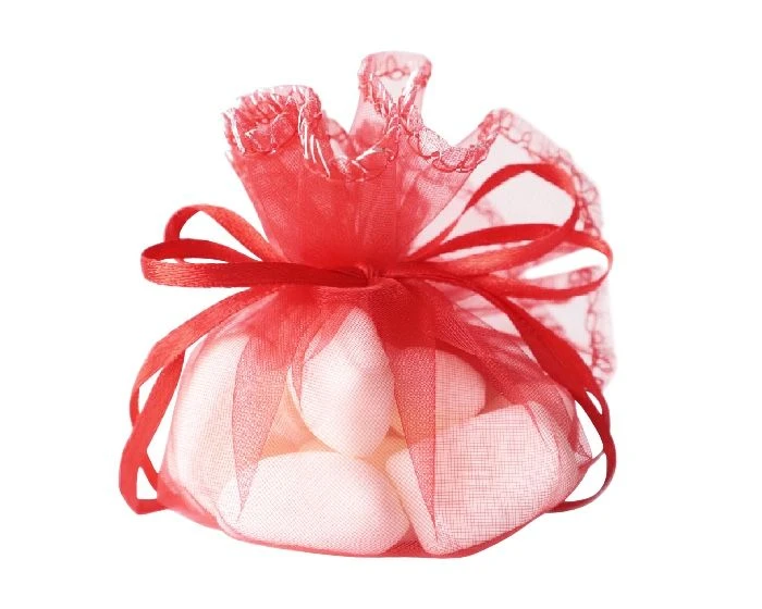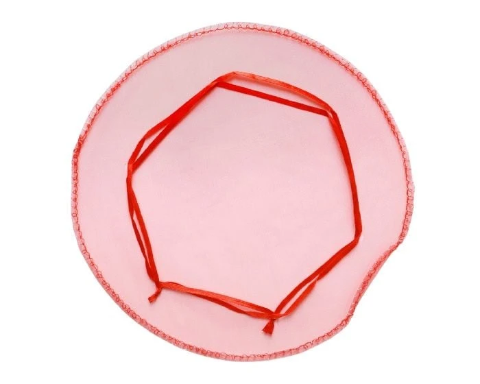Ronde organzazak in de kleur rood. Deze ronde organzazak met lint heeft een diameter van 24 cm. Door aan het lint te trekken wordt het platte stuk stof een mooi bol zakje. Per 12 verpakt.