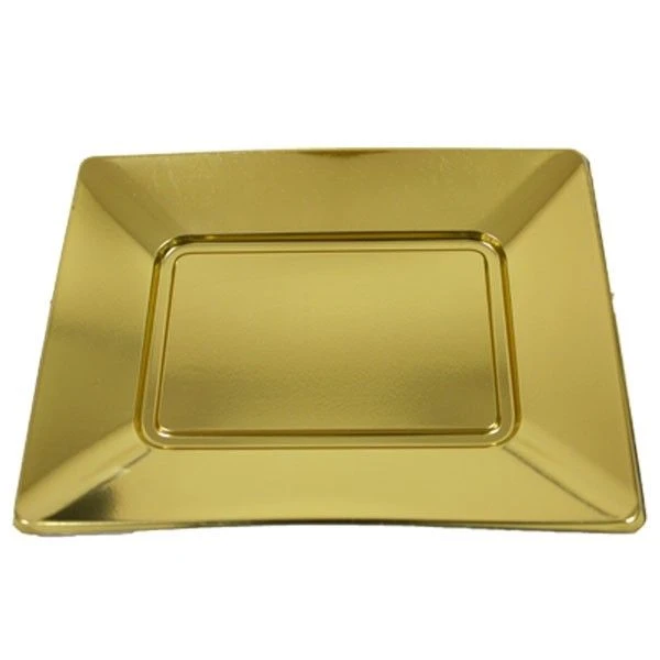 Plastic rechthoekige borden in de kleur goud. De borden hebben een afmeting van 23 x 17 x 1,5 cm (lxbxh). Een verpakking bevat 6 borden. NB: De borden zijn geschikt om in de magnetron te gebruiken en zijn herbruikbaar na het wassen.